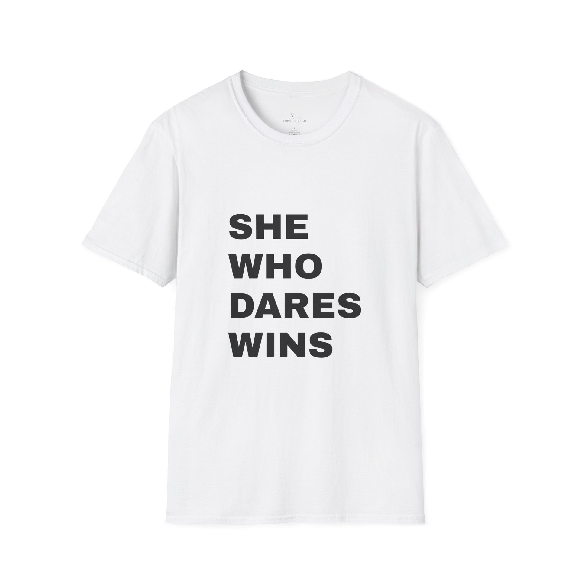 Make a fearless fashion statement with our best-selling 'She Who Dares Wins' slogan t-shirt - designed for women who live life unapologetically (like Del Boy). Crafted from soft, breathable cotton, our best-selling slogan tee is ideal to wear with jeans for a casual look, or layer under a blazer for bold workwear.